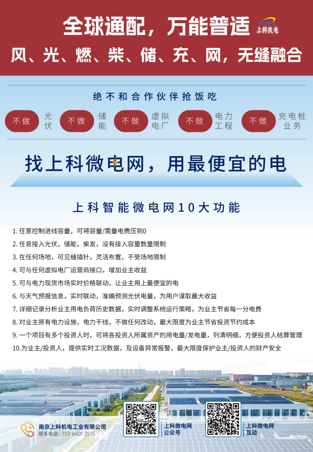 南京上科机电工业有限公司是一家专业从事光伏、储能设备集成制造、微电网改造、电力施工、土建施工、消防施工、电力运维和制造安装高低压配电装置的现代化股份公司。