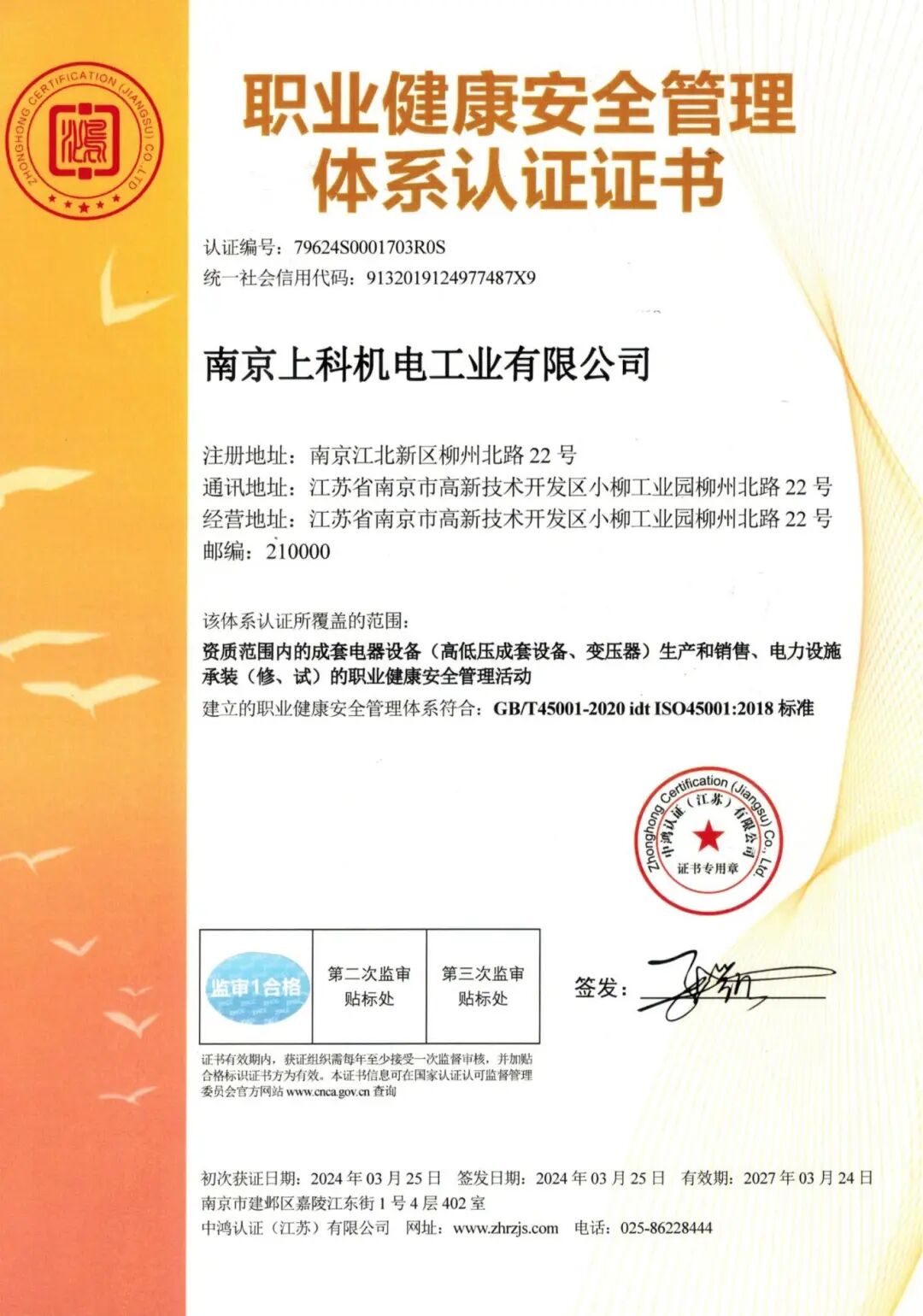 资质齐全:公司一次性通过了GB/T19001-2016 idt IS09001:2015 标准质量管理体系认证、GB/T45001-2020 idt IS045001:2018标准职业健康安全管理体系认证、GB/T24001-2016 idt IS014001:2015 标准环境管理体系认证。企业获得AAA资信等级证书,售后服务认证证书五星级证书,安装施工资质证书等。拥有不同类型的配电柜的强制性认证产品符合性自我声明证书,特别是储能及微电网业务领域,是国内最早一批获得智能型消防储能一体柜型式试验报告,“微电网终端数据采集隔离转换系统”获得计算机软件著作权登记证书,中国软件测评中心测试报告。 2025年获得北京金浪国际展览服务有限公司“储能行业先锋奖”称号。
