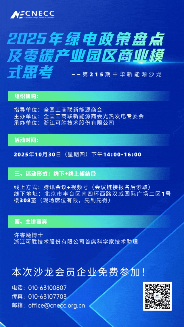 为帮助会员及相关单位准确把握2025年绿电政策的最新动态与核心要点,共同探索零碳产业园区的创新商业模式与盈利前景,我会拟于10月30日举办“2025年绿电政策盘点及零碳产业园区商业模式思考”沙龙。届时将邀请商会副会长单位浙江可胜技术股份有限公司首席科学家技术助理许睿飏博士进行深度解读与分享,欢迎业界同仁积极参与。